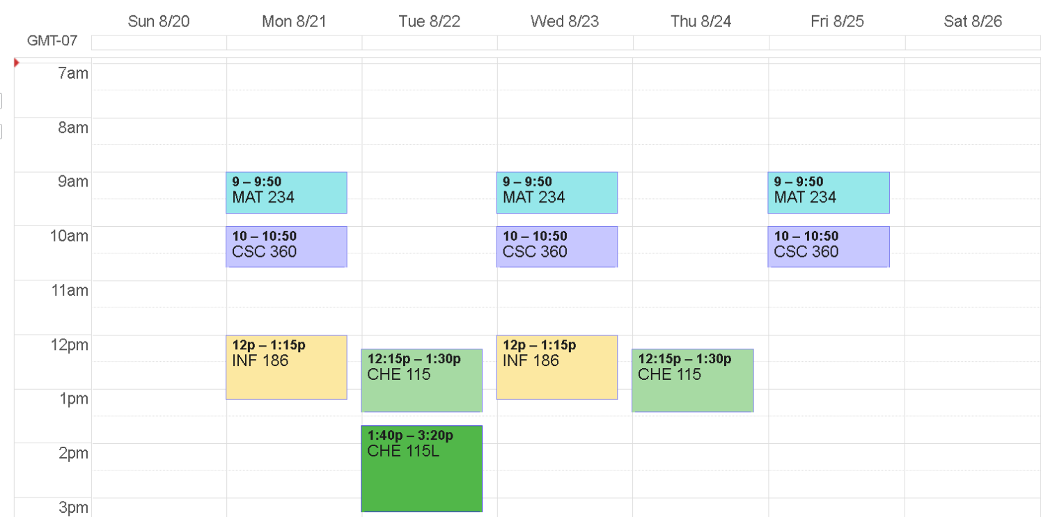 I just officially confirmed my schedule for the fall last week, and again I made sure to leave time in the morning and afternoon. However, this time the mornings I have off I’m going to use to go the gym because I prefer morning workouts, and then in then I'll have a couple hours almost every day to do homework and hang out with friends before I'll be scheduled to work at my off-campus job.
