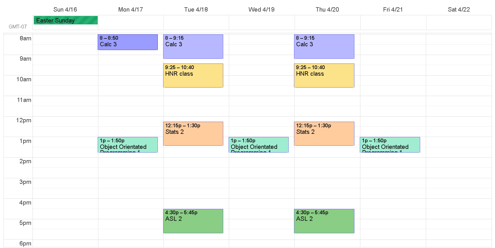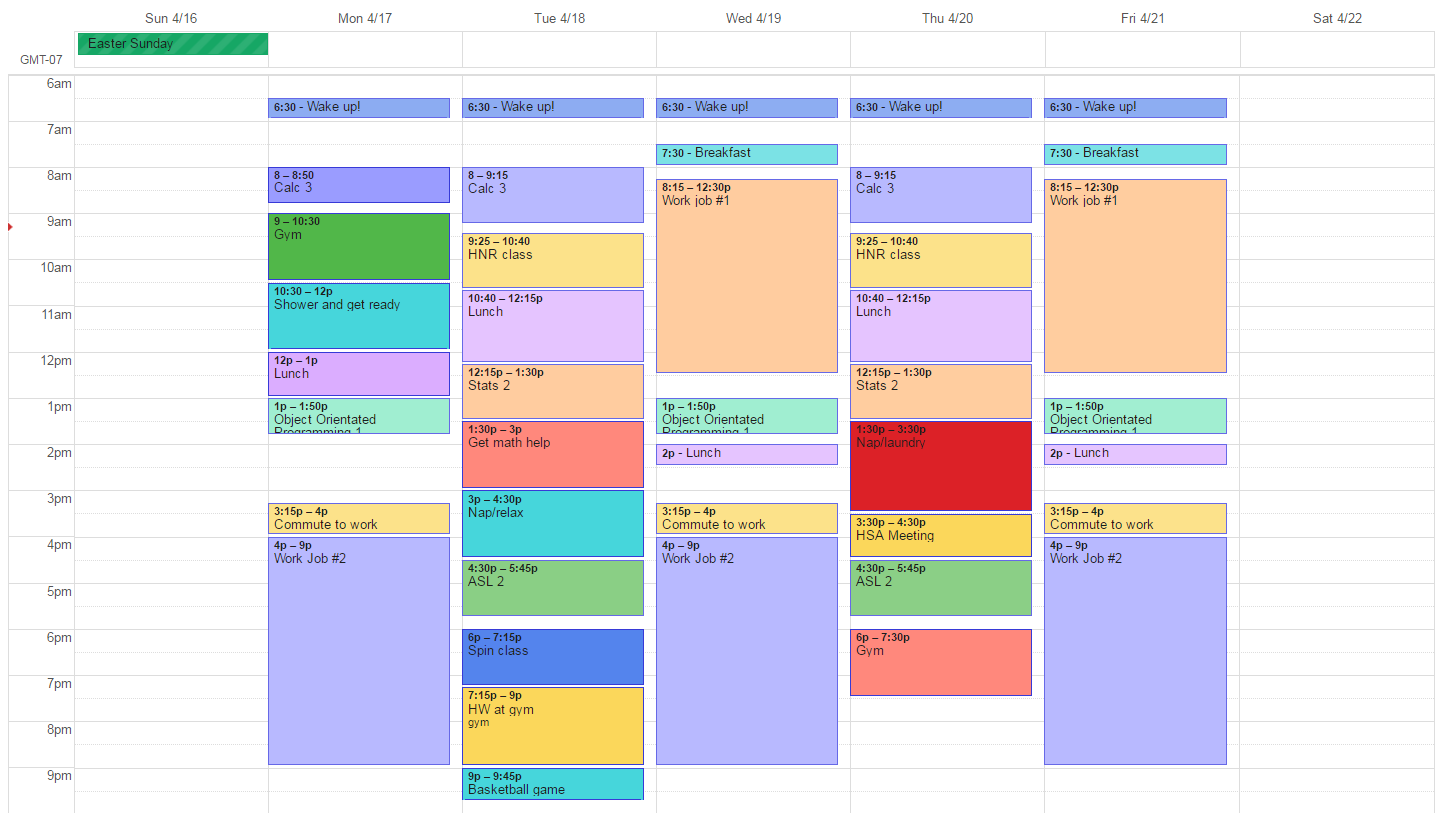 I’ve slowed down a bit since spring break, and have been giving myself more rest and sleep, but the weeks before spring break I was totally overexerting myself. My typical weekly schedule looked something like this: